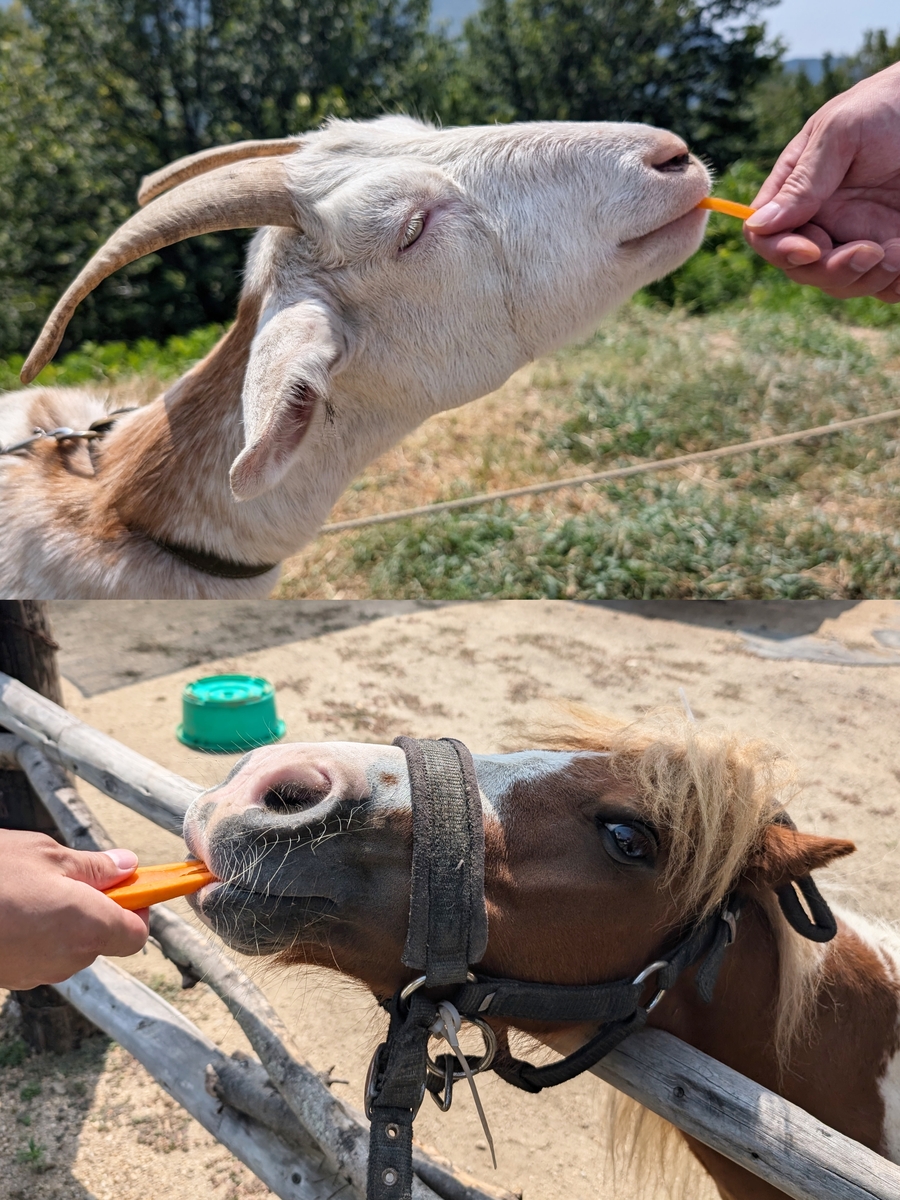 ヤギのいちごちゃんとポニーのよさく君に、100円でエサやり体験ができます。